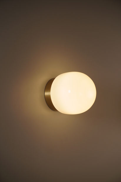 Made with brass construction and opal glass, it has a modern and sophisticated style, and diffuses a soft, even filtered light to create a warm and cozy atmosphere.